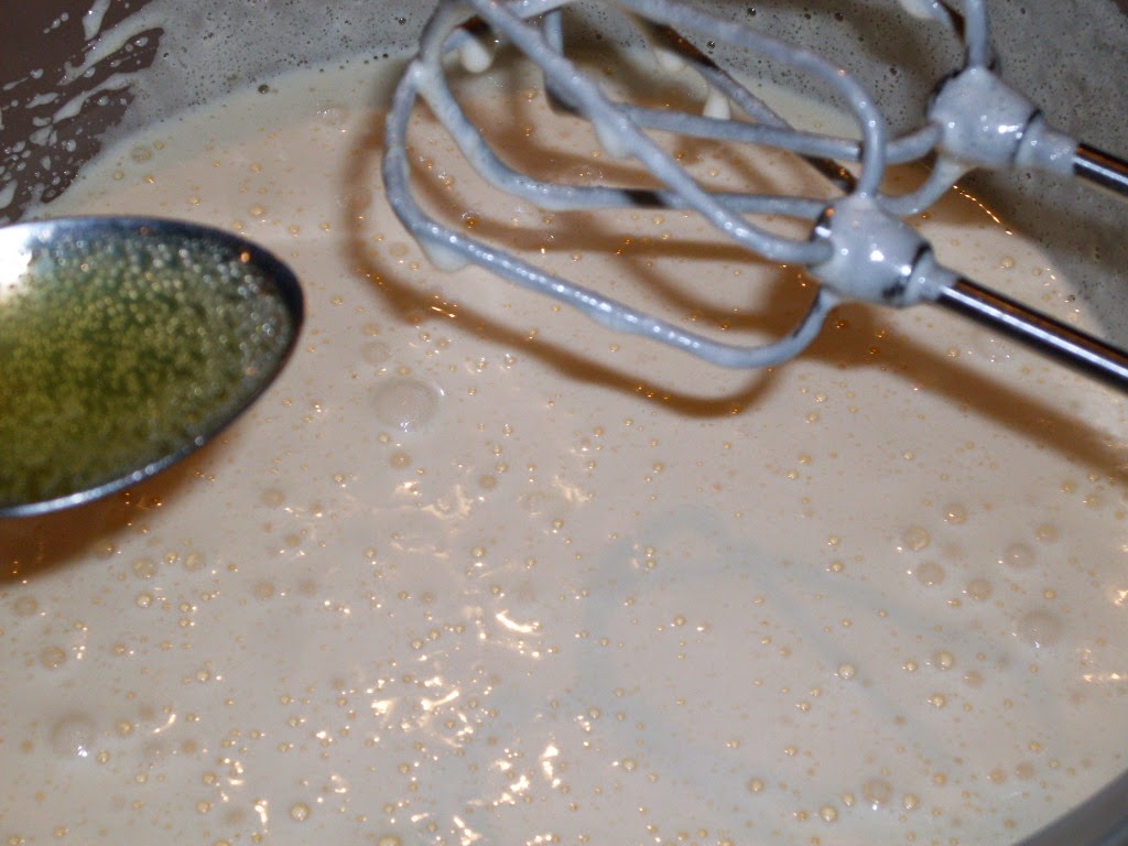 - Прибавям лъжица по лъжица лимонадата, като разбъркването продължава.