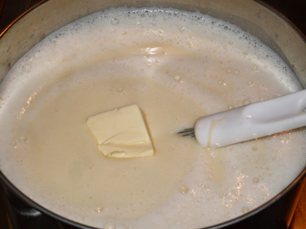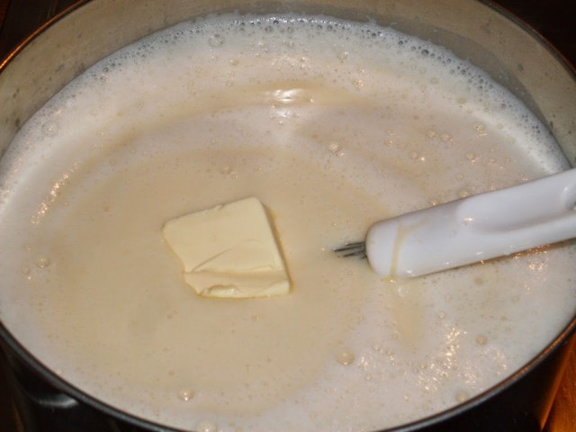- Преди да започне да се сгъстява, добавям бучката краве масло и разбърквам до разстопяването му. Отделям от котлона.
