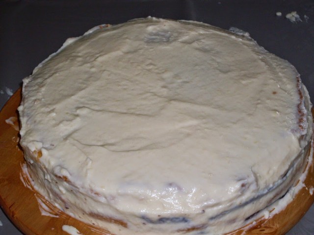- Подреждам блатовете един върху друг и намазвам цялата торта отгоре и отстрани.