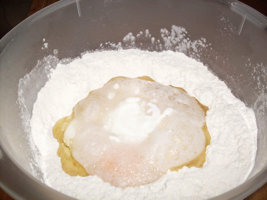 - В дълбока купа изсипвам брашното и правя вдлъбнатина, в която слагам олиото, яйцето, солта, содата, разтворена в оцета и киселото мляко.