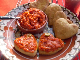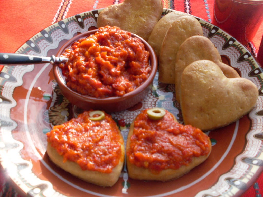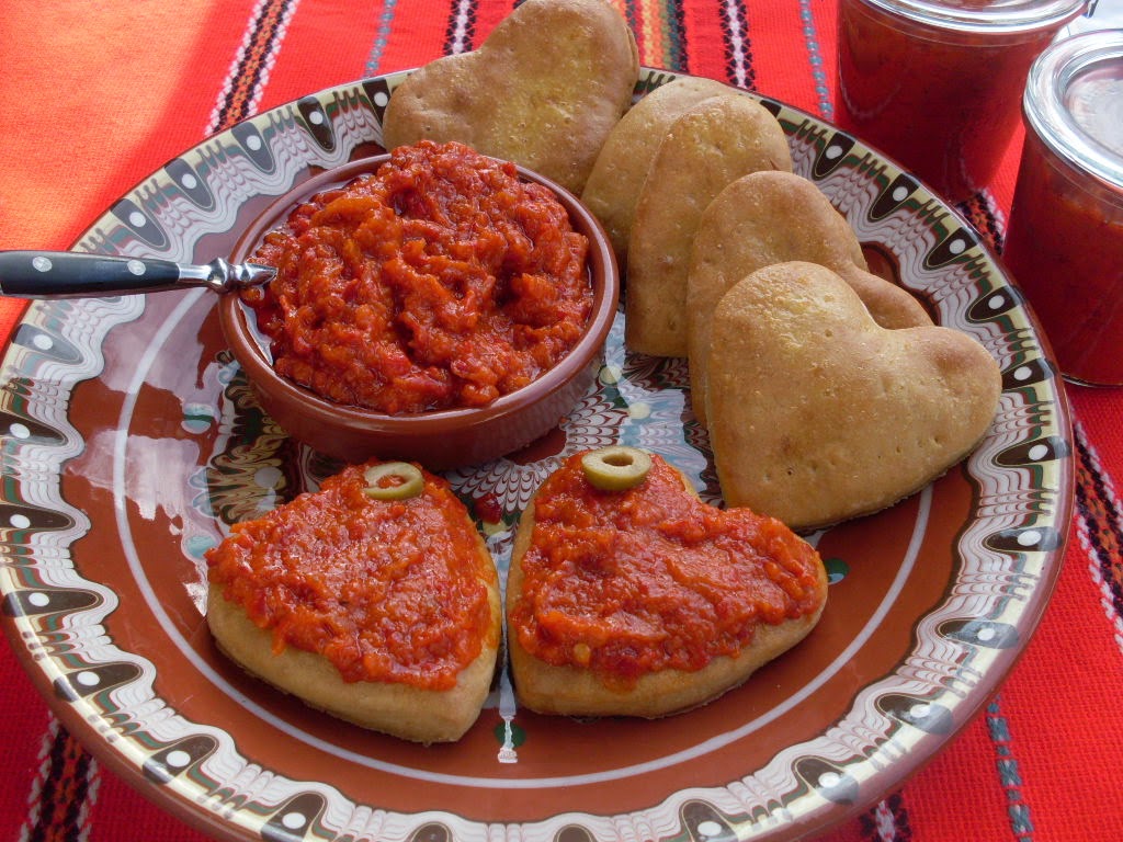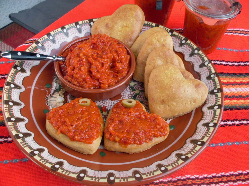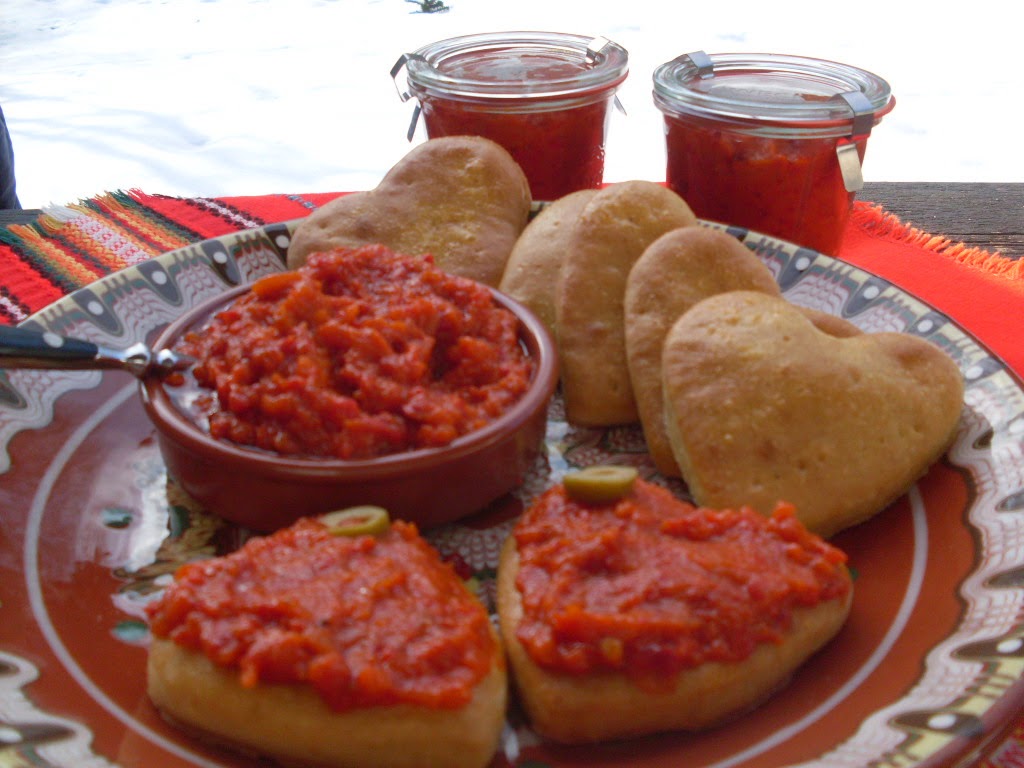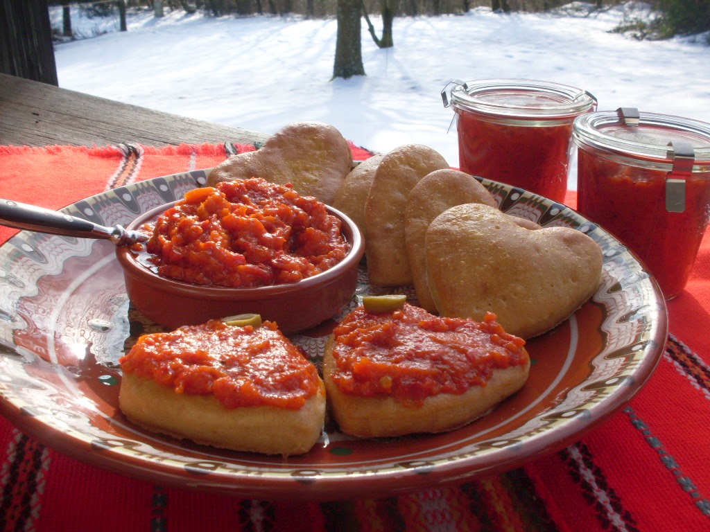 За да спазя и традицията за червен цвят в деня на Свети Валентин, приготвих и Домашна лютеница, която много обичаме и с нея намазах питките.
