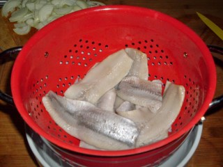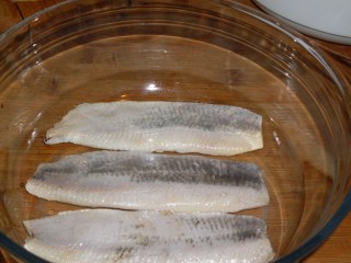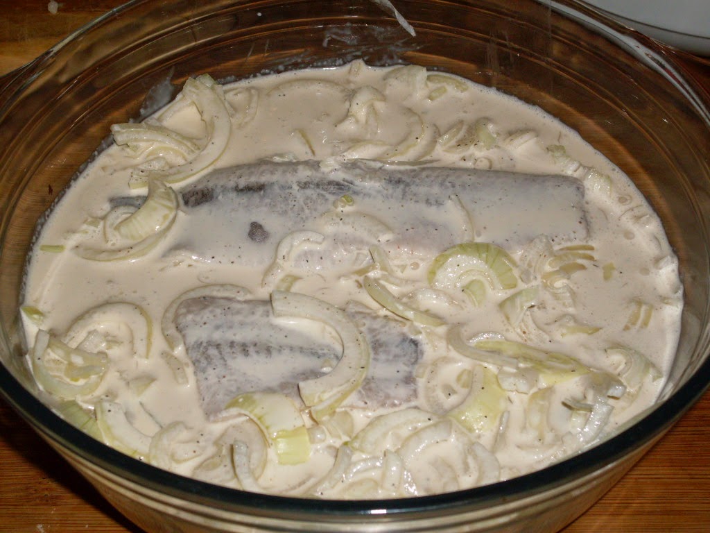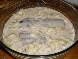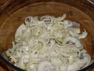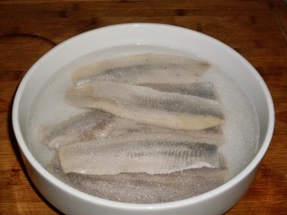 - Заливам подредената херинга със студена вода. Това се прави с цел да се отдели излишната сол от рибата.