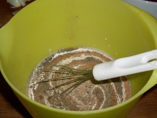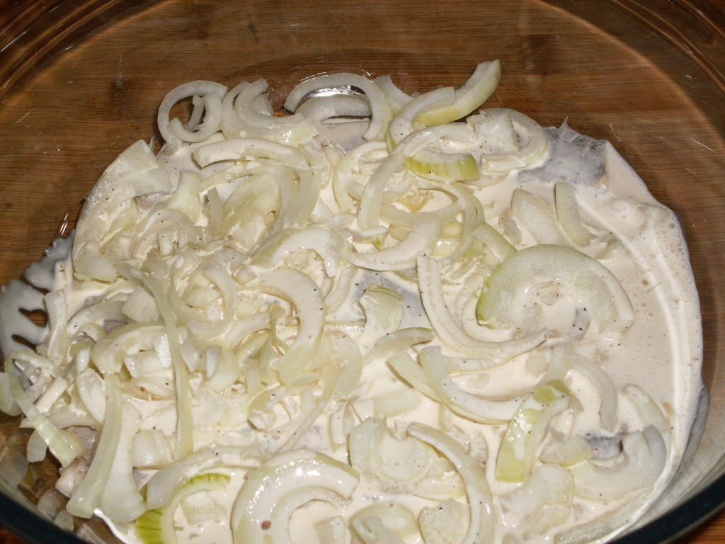 - В купа изсипвам сметаната и добавям черен пипер, маги, оцет и индийско орехче. Разбърквам и задължително пробвам на вкус. Ако е добре овкусено продължавам, но ако не – добавям съставката, която ми липсва. Това определяте Вие сами. Не добавям сол, защото рибата е предварително осолена.