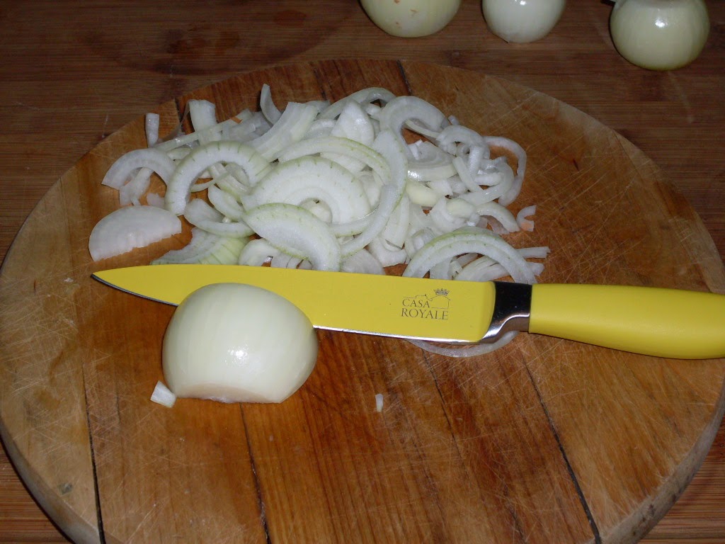 - Обелвам главите лук, режа на половина и после на тънки шайбички по дължина. Така се получават лучени лентички.