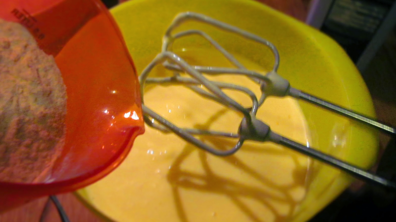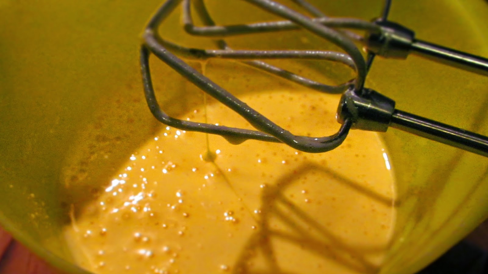 - Добавям брашното, но малко по малко и с непрекъснато разбиване с миксера, но на минимална степен на мощност. Разбиването е само докато се поеме цялото количество брашно.