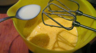 - В подходяща купа разбивам яйцата и захарта достатъчно дълго време или докато се получи пухкав крем. Разбиването не бива да е по-малко от 5 минути. Добавям ванилията и разбиването е само няколко секунди.