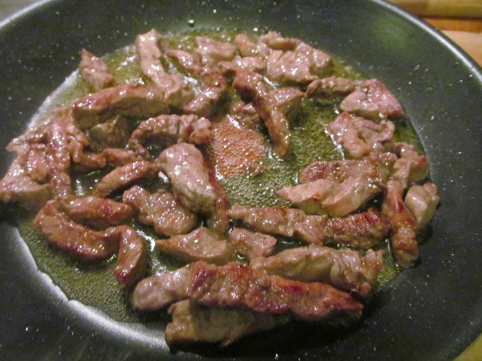 - Загрявам на максимална степен на котлона мазнината и изпържвам за кратко в нея лентичките телешко месо. Когато сложа месото, намалявам котлона с половин степен. Моята печка им само 3 степени. Важното е да почервенее месото от всички страни, но да не се изпържва до готовност, защото има опасност да остане жилаво. Самото пържене продължава около 7 – 8 минути.