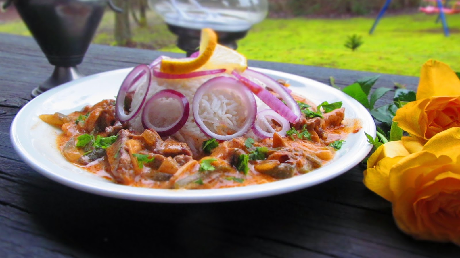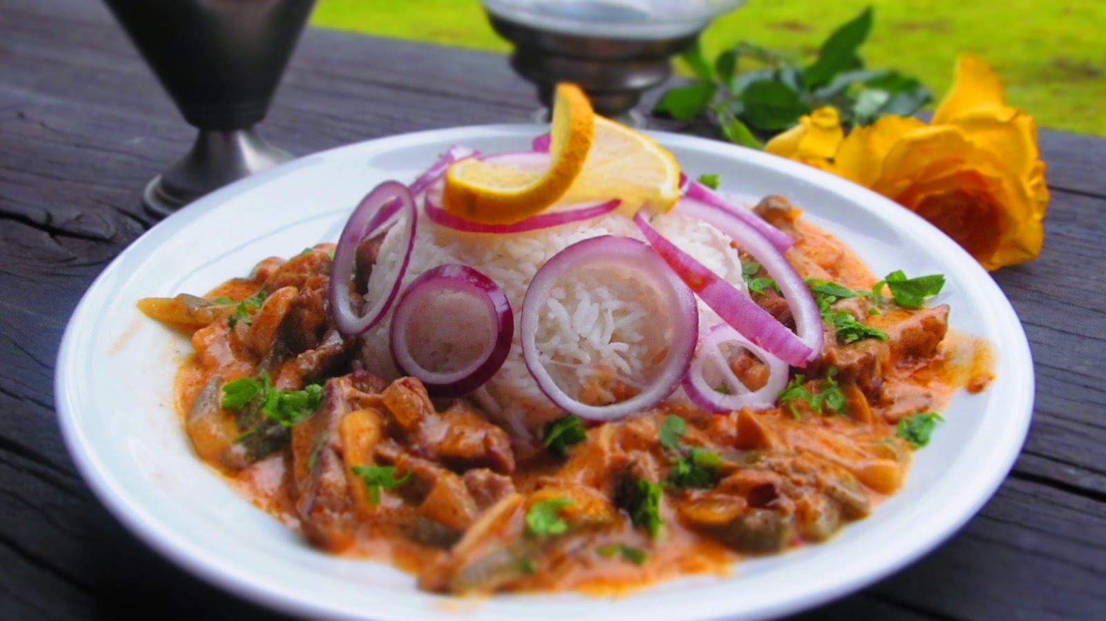 Сервирам Бьоф „Строганов“ гарниран с ориз, поръсен със пресен магданоз и декорирам с кръгчета салатен лук и резенче лимон.