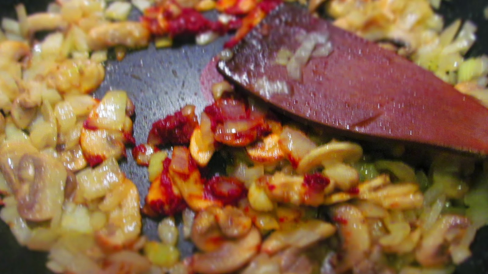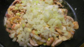 - Добавям към гъбите нарязания на ситно кромид лук и го изпържвам само до омекването му. Не позволявам на лука да потъмнява.