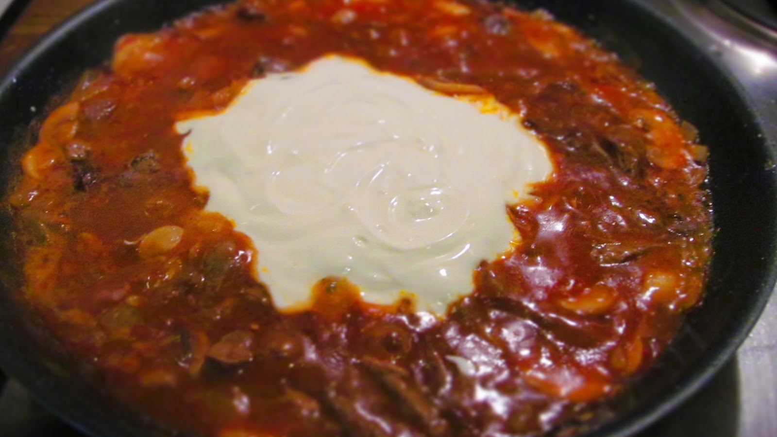 - Разбърквам предварително заквасената сметана и я добавям към леко къкрещото ястие.