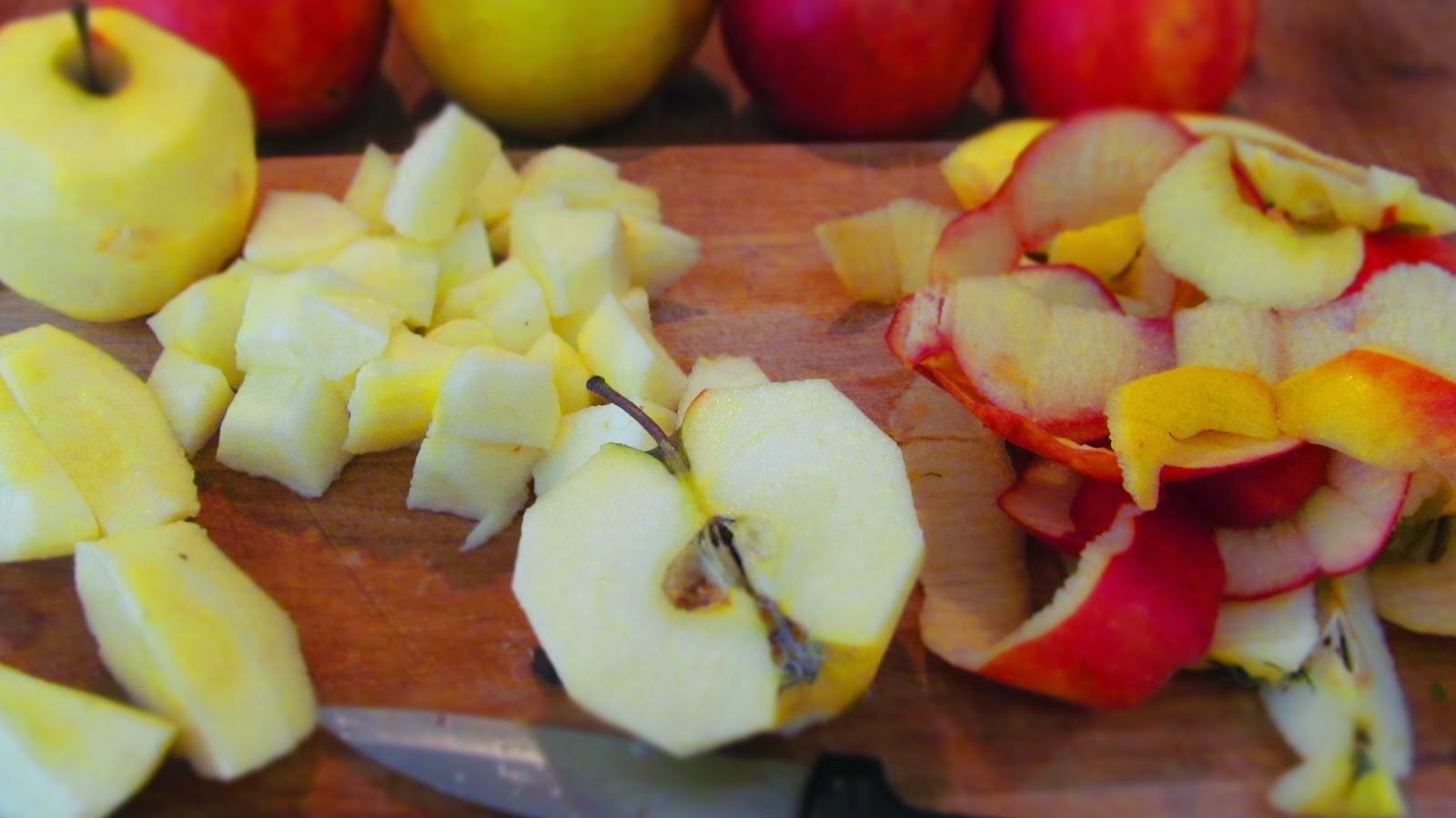 • Добре измитите ябълки обелвам, почиствам от семките и нарязвам на кубчета.