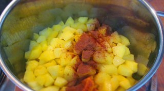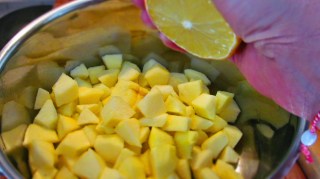 • Кубчетата ябълки изсипвам в подходяща по размер тенджера и върху тях изтисквам сока на половин лимон. Това го правя с цел – запазване на ябълковите кубчета от потъмняване. Всички знаем, че обелената и нарязана ябълка много бързо променя цвета си.