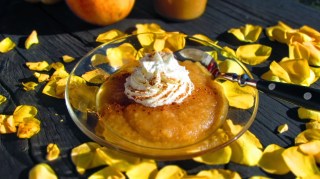 Сервирам ябълковия мус за десерт, декориран с разбита сметана и поръсен с канела.