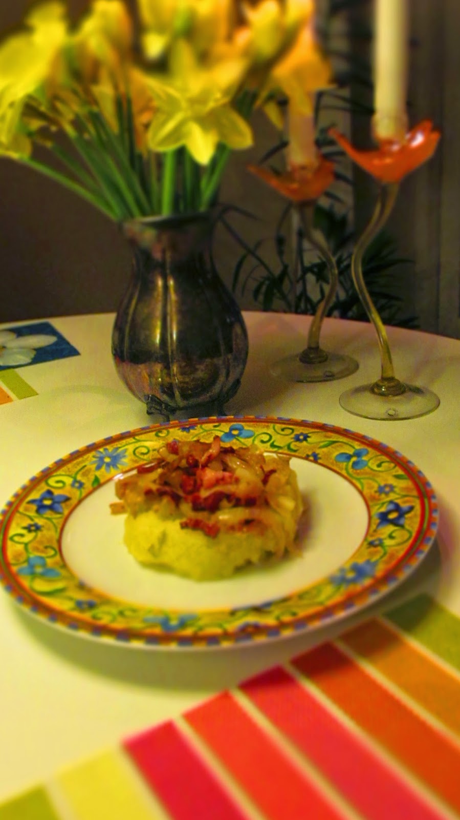 - Връщаме топлите бекончета в тигана при лука и разбъркваме. Изключваме котлона и оставяме за около 2 минути, или докато се смесят вкусовете на бекончетата и карамелизирания лук.