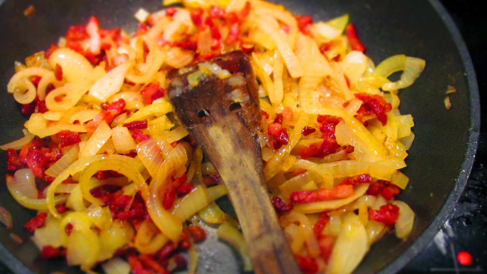 - Пускаме лентите кромид лук в мазнината, останала от бекончетата и изпържваме до пълното му омекване, като бъркането е почти непрекъснато, за да не изгори.