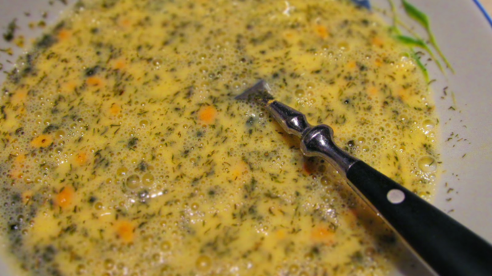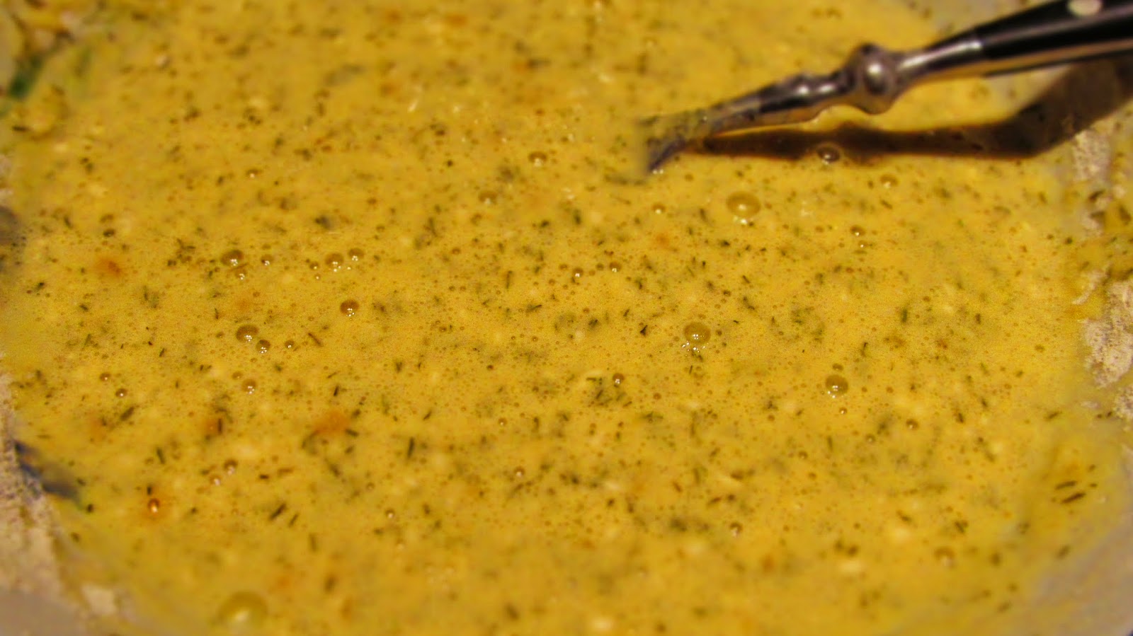 - В подходяща купа или дълбока чиния разбиваме двете яйца и добавяме сметаната, горчицата и копъра и отново разбиваме.