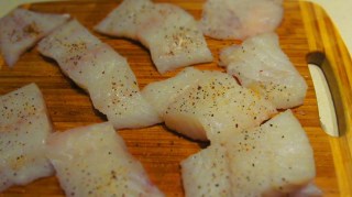 - Посоляваме рибата и поръсваме с прясно смлян цветен пипер.