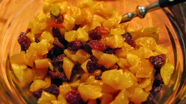 - Докато чаках тестото да втаса, приготвих плънката. Кайсиите нарязах на малки кубчета, добавих стафидите и полях със 7 с. л. вода. Добавих настъргания или нарязан на малки кубчета марципан и 1 яйце. Разбърках всичко.