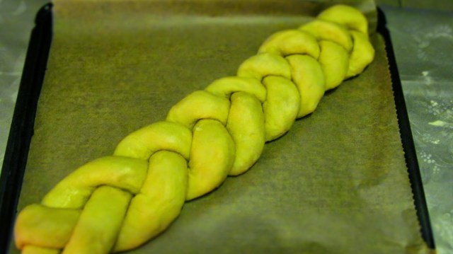 - В тавата от фурната постлах хартия за печене и поставих готовата плитка, но по диагонал на тавата.