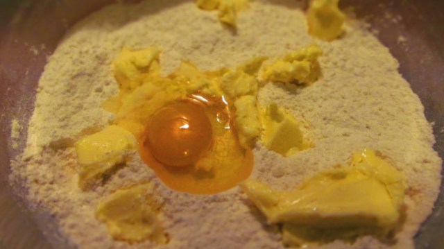 - В подходяща по размер купа, смесвам брашното, солта, захарта, ванилията и сухата мая. Добавям кубчета от мекото масло и едно яйце.
