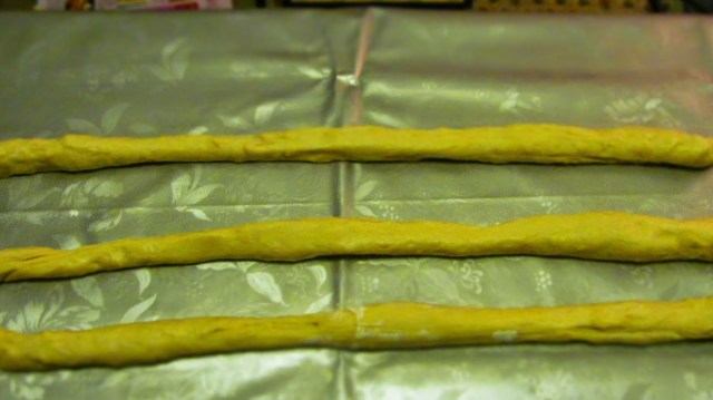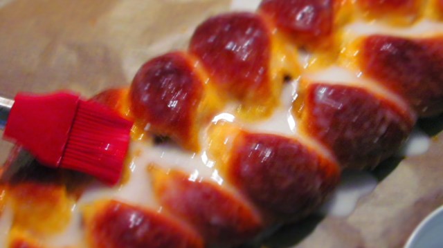 - Втасалото тесто намазах с един жълтък, разбит с 2 с. л. прясно мляко.