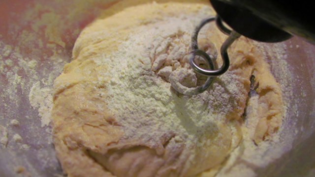 - Добавих млякото към брашнената смес и с помощта на миксер и накрайниците за тесто, замесих меко тесто. Ако случайно брашното не е достатъчно, както се получи при мен, добавяте още – до получаването на топка тесто. Тестото трябва да е пухкаво и меко. Аз добавих още около 70 гр. брашно. Това обаче зависи от типа брашно и от начина по който измервате продуктите. Не съм омесвала допълнително на ръка тестото.