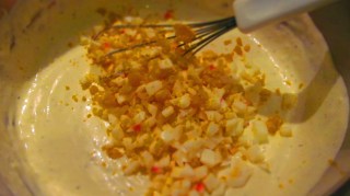 - Добавям, обелените и нарязаните на много ситни кубчета,твърдо сварени яйца. Разбърквам.