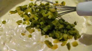 - Добавям към соса нарязаните на много ситни кубчета кисели краставички. Разбърквам.