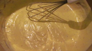 - В подходяща по размер купа смесвам майонезата, киселото мляко и крем фреш. Разбивам всичко до получаването на еднородна смес. Овкусявам с горчицата и лимоновия сок.