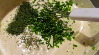 - Към добре овкусения сос Ремуладе добавям всички зелени подправки и разбърквам.