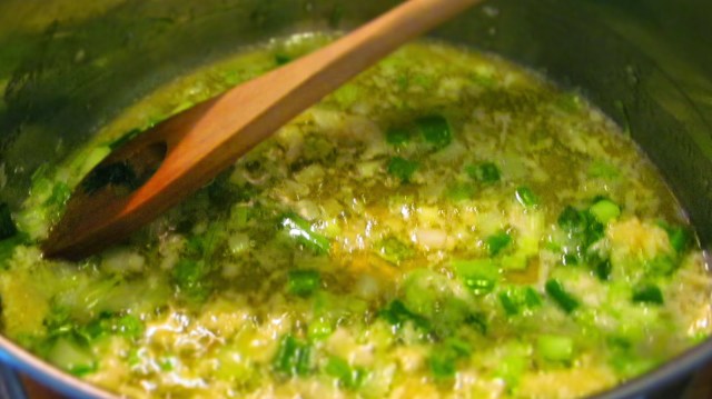 - Добавям към маслото ситно нарязания зелен лук и пресен чесън, ако е стар чесън – пасирам предварително. Задушавам до омекване.