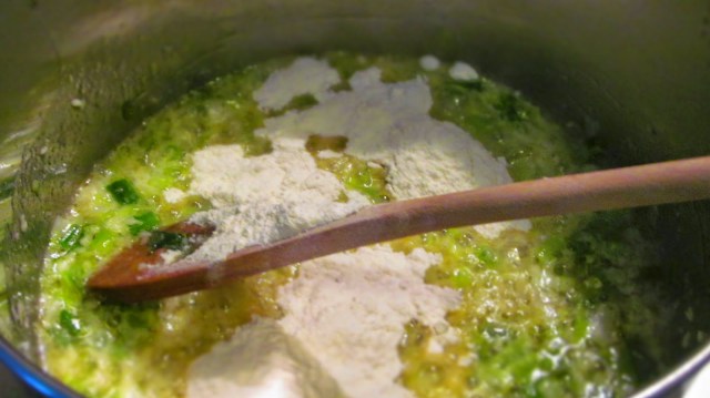 - Поръсвам с двете супени лъжици брашно и с непрекъснато бъркане, запържвам до получаването на златист цвят на брашното.