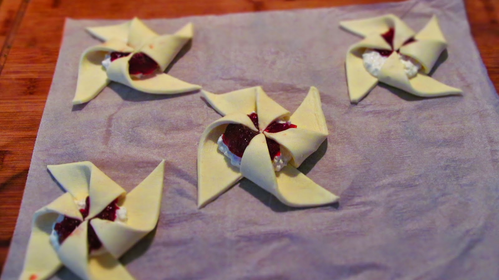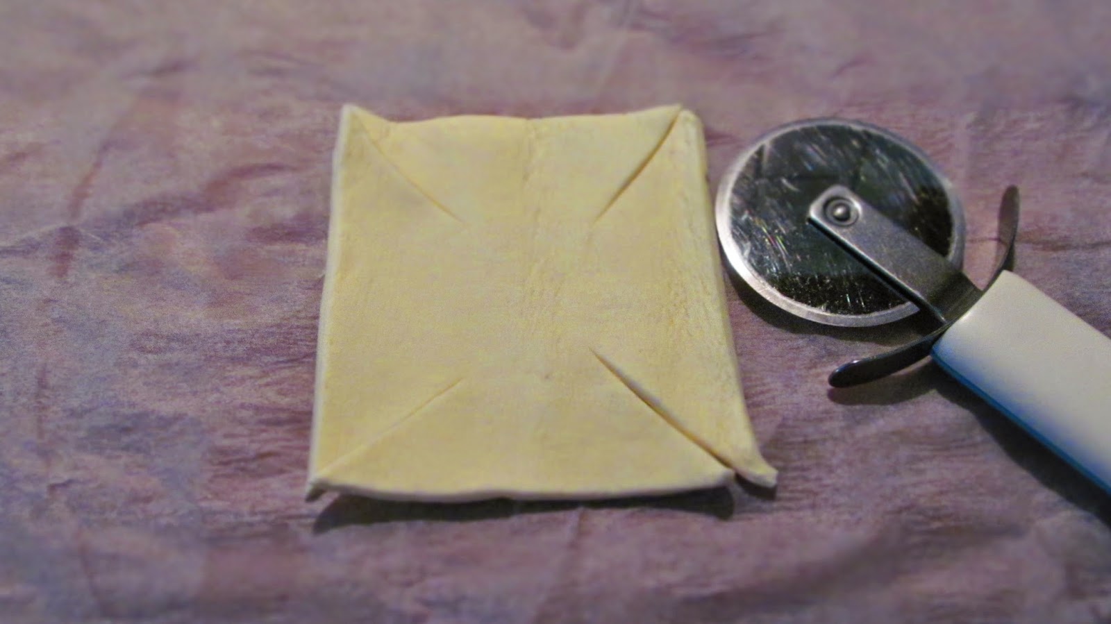 - Четирите ъгъла на всеки квадрат изрязвам по диагонал, но разрезът стига само до средата на квадрата. За рязането на бутер тесто използвам резец за пица.