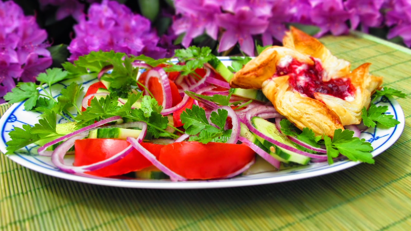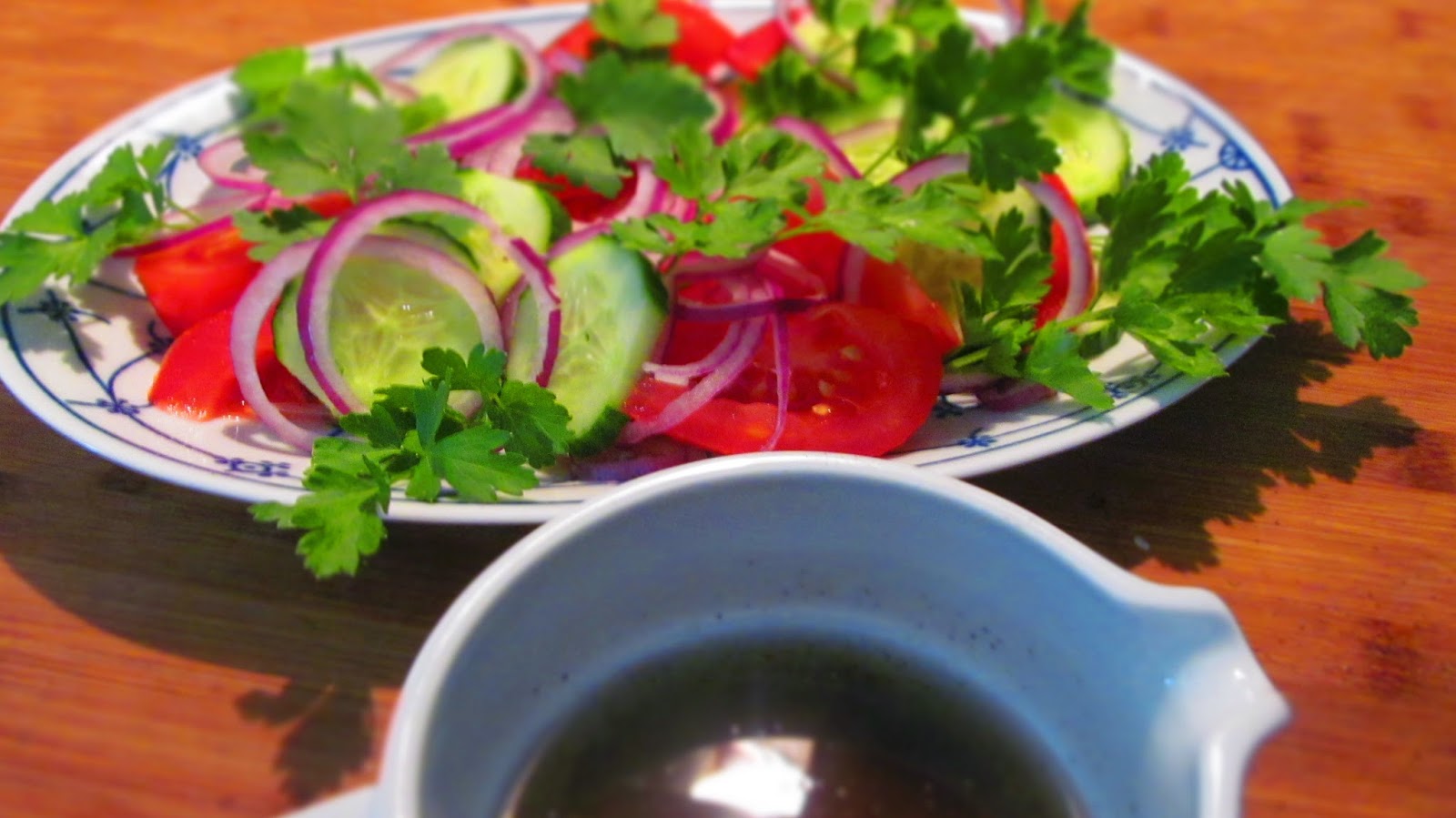 - Приготвих си салата от домати, краставици, червен лук и много магданоз, която залях с най-обикновен дресинг от олио 3 части, оцет 1 част, сол, черен пипер и щипка захар.