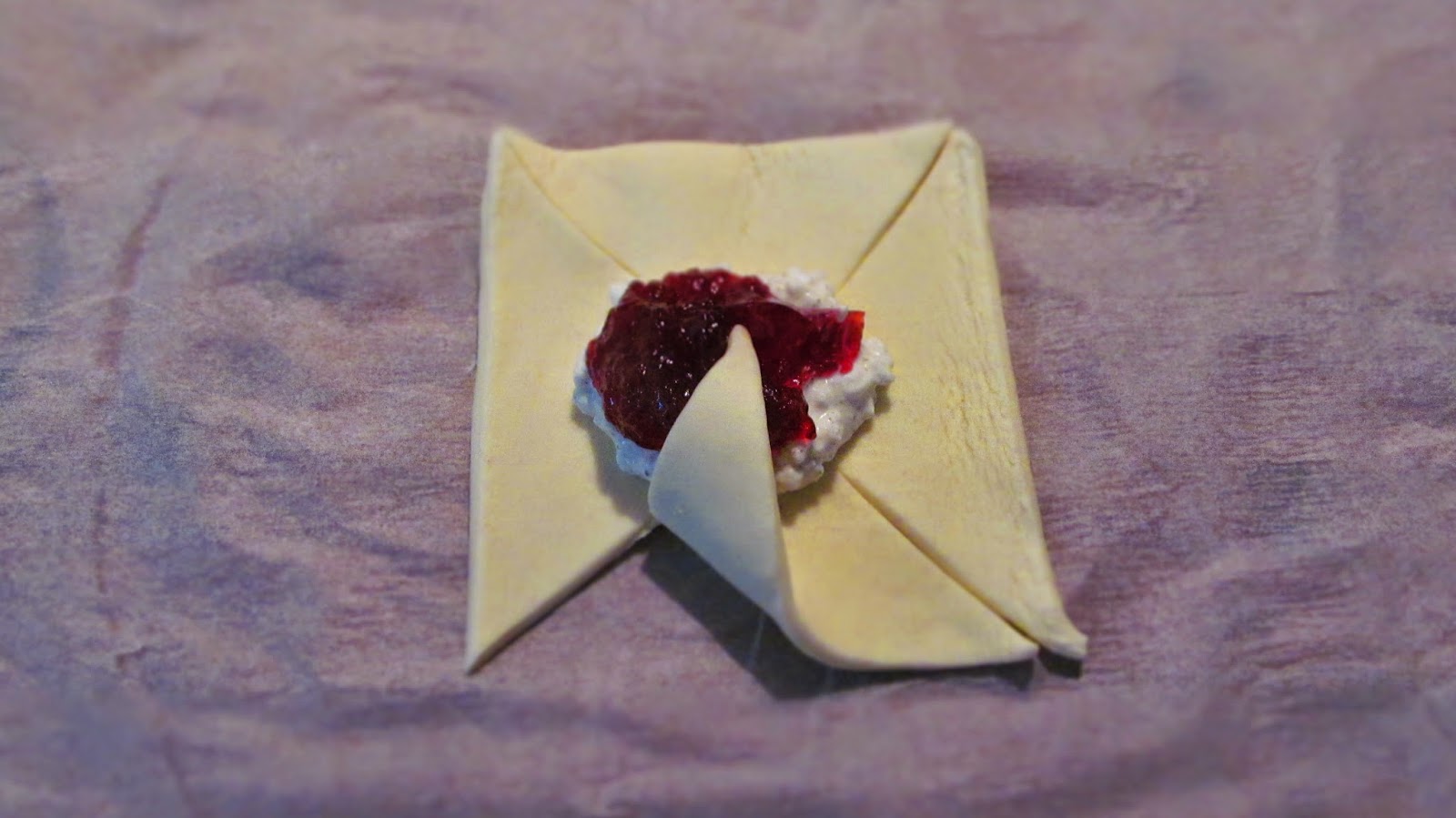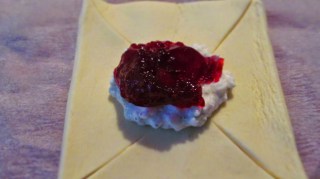 - Сгъвъм левия ъгъл на всеки един от четирите, получили се след разрязването на квадрата ъгли, към средата на квадрата, върху боровинките.