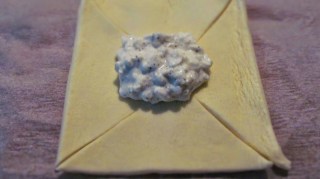- В средата на всеки квадрат слагам по една пълна ч. л. от сиренето.