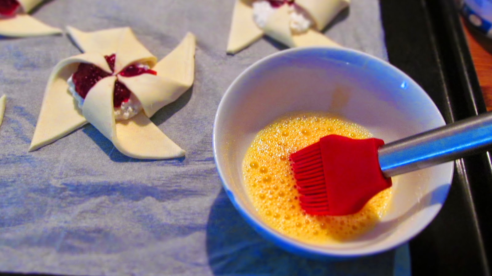 - Разбих жълтъка с две с. л. студена вода и намазах въртележките.