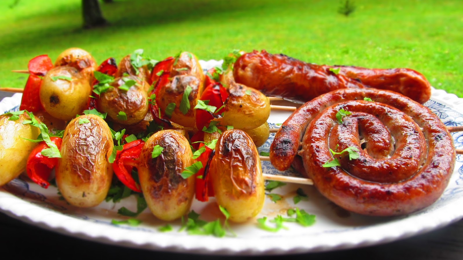 Гарнитурата от шишчета с пресни картофки, изпечени след месцата и поели аромата им, поляти с лимоново-чесново сосче е неописуемо вкусна!