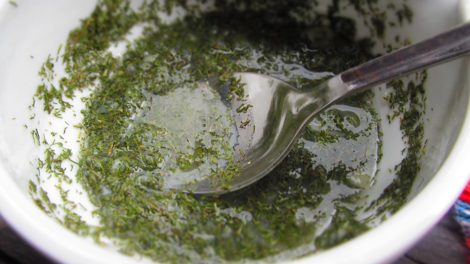 • От сока на лимона, обелената и пасирана скилидка чесън, ситно нарязания копър и малко сол, приготвям сосче.