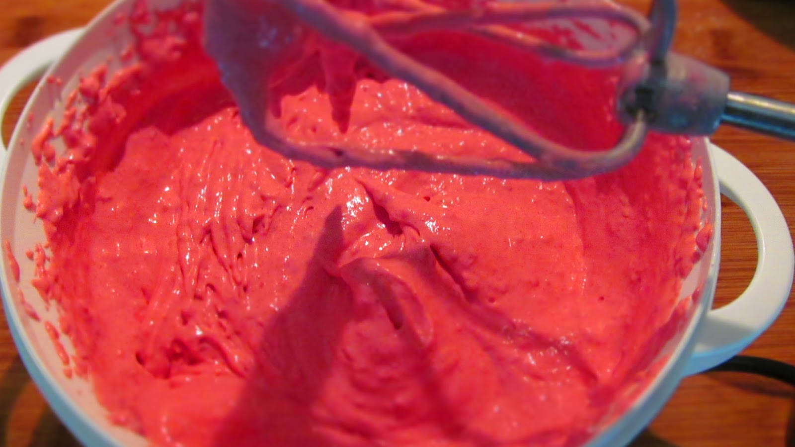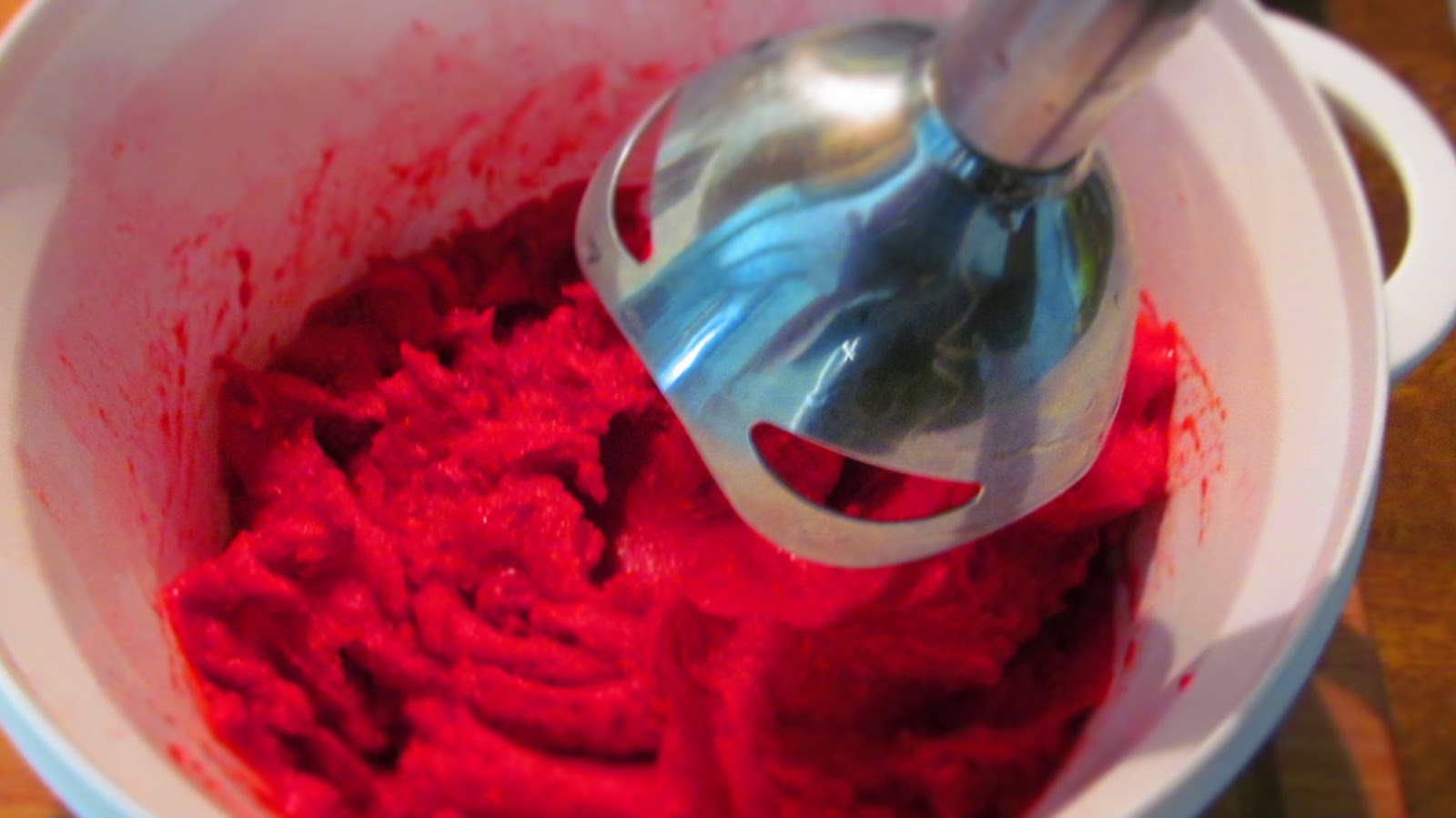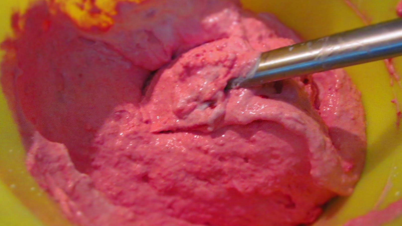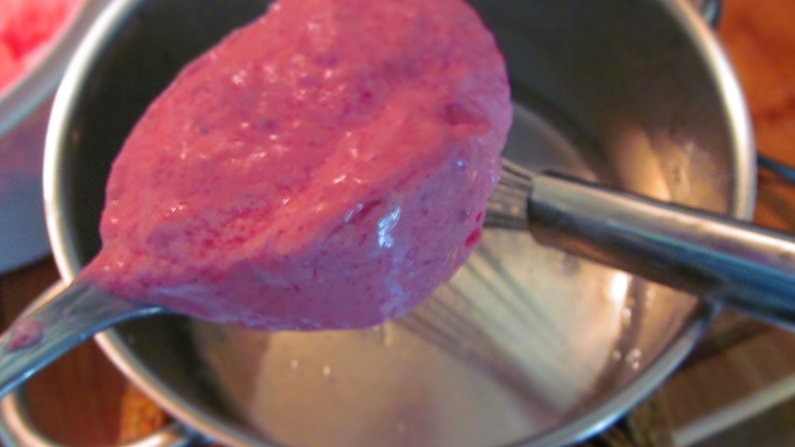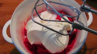 • Добавих към течния желатин няколко лъжици от малиновия крем, като непрекъснато разбивах. Това се прави, за да се уравновеси температурата на желатина с температурата на малиновия крем.