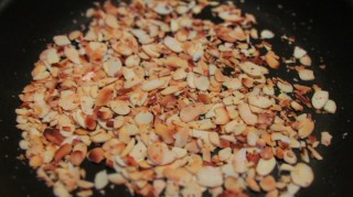 • През това време в сух тиган изсипах люспите от бадеми и ги запекох до златисто и с постоянно разбъркване, на максимална мощност на котлона.