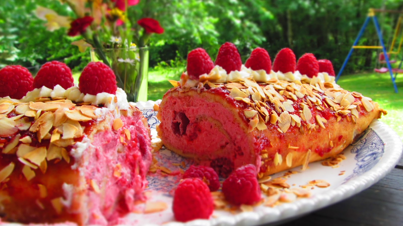 Хей така – без повод. В очакване на по-топли дни, в мечти по почивката в България и на Черно море, в непрекъснато палене на барбекюто, се роди и това малиново руло. Пазарувайки месо и зеленчуци за скарата, видях пресни малинки. Много примамливо изглеждаха и не им устоях. Купих ги и чак тогава реших какво ще направя от тях, защото ние не сме много по суровото консумиране на плодове. Нужната доза плодове си я взимаме под формата на сладкиши.