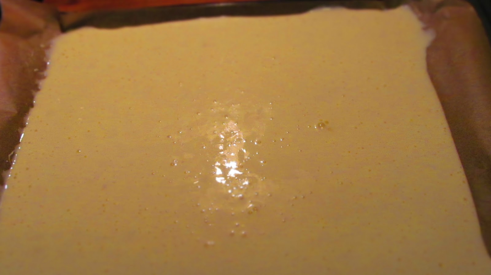 • В тавичката, която е с размера на фурната, постилам хартия за печене. Върху хартията изсипвам пандишпановото тесто и разнасям по цялата площ на тавата. Фурната загрявам предварително до 200 градуса, долно и горно печене. Печенето на пандишпановия блат продължи около 15 минути.