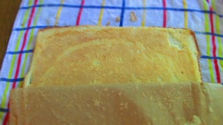 • Горещия пандишпанов блат навих на руло, заедно с кърпата. Това се прави, защото ако се остави да изстине, пандишпановото тесто става много чупливо и е невъзможно навиването му.