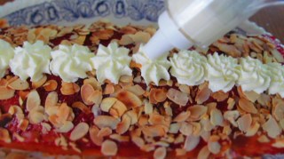 • Разбих останалата сметана и декорирах със сметанови розички рулото, а върху всяка розичка сложих от пресните малини.
