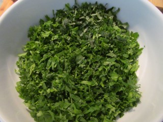 - Нарязвам цялото количество магданоз и джоджен на възможно най-ситното.