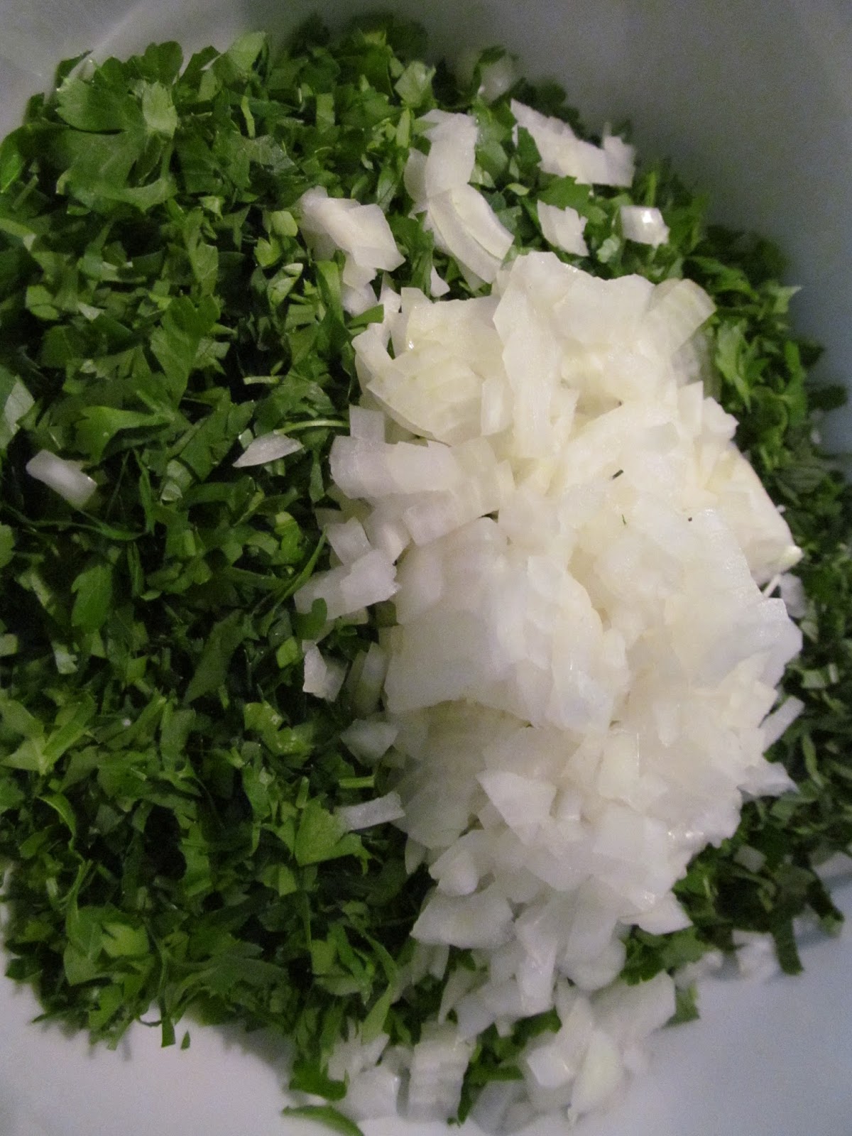 - Нарязвам кромидия лук на възможно най-ситните кубчета и добавям към магданоза.