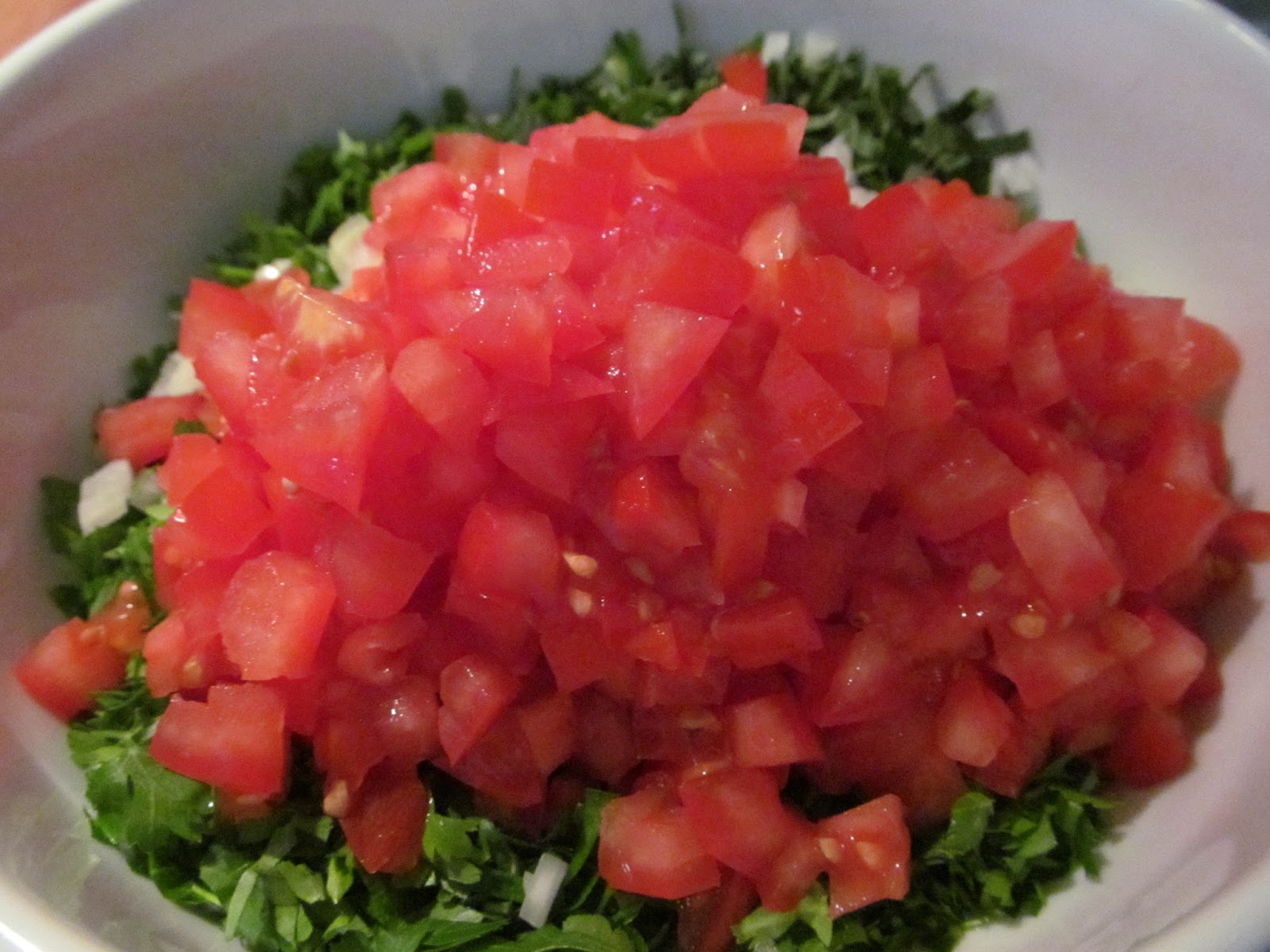 - Нарязвам доматите на възможно най-ситните кубчета, като отделям семената им и добавям в купата с магданоз и лук.