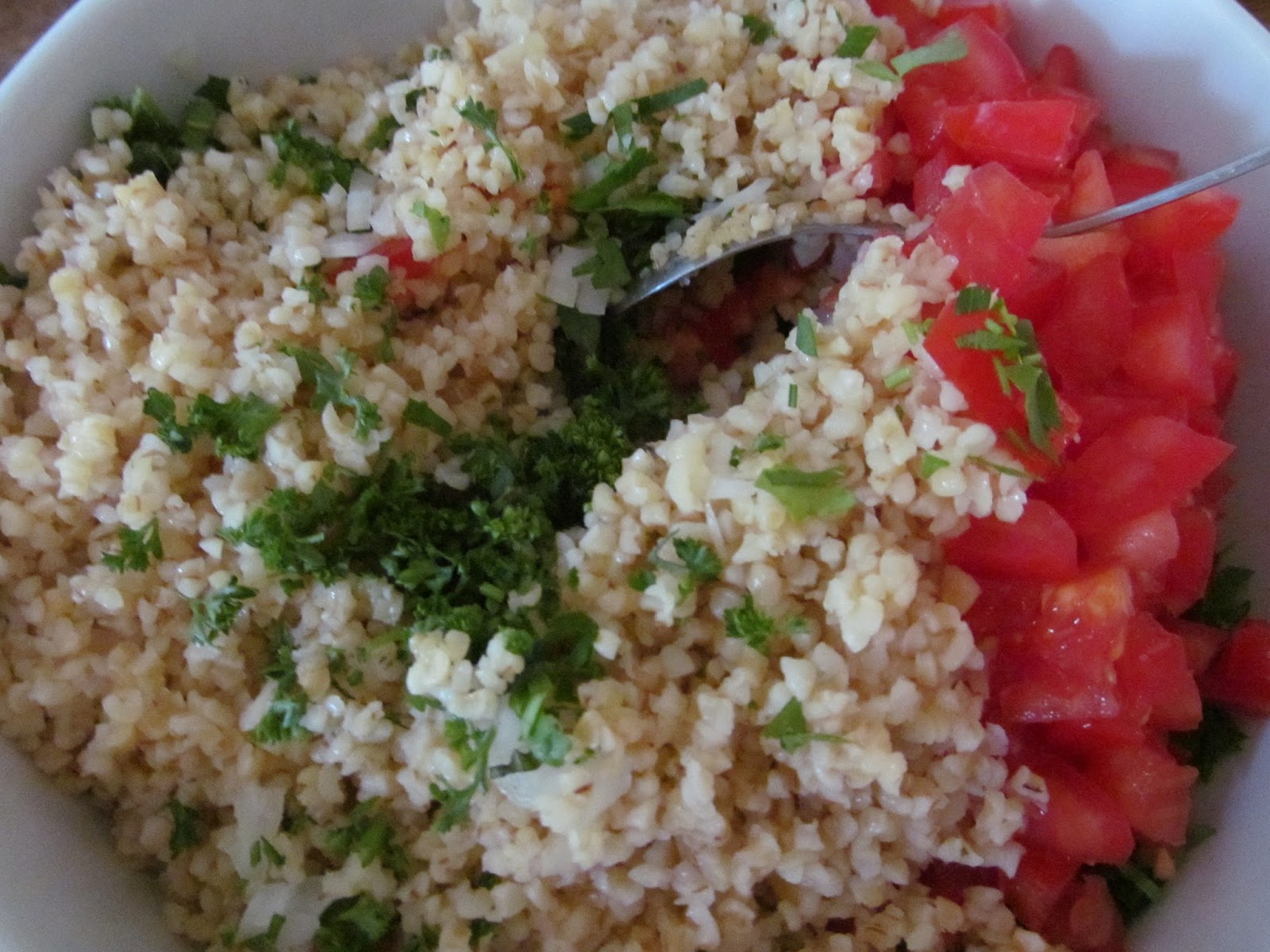 - Добавям добре изцедения булгур към ситно нарязаните зеленчуци.