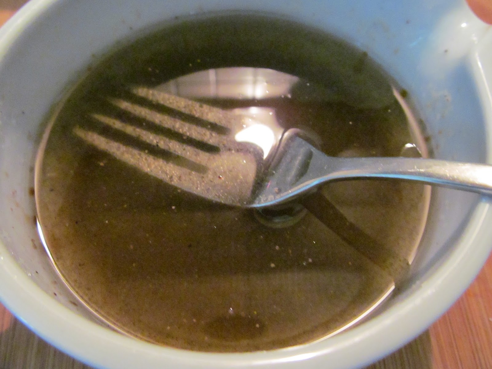- В купичка смесвам олиото, лимоновия сок, солта, черния пипер, Маги, чесновия прах и малко захар. Разбърквам всичко добре.